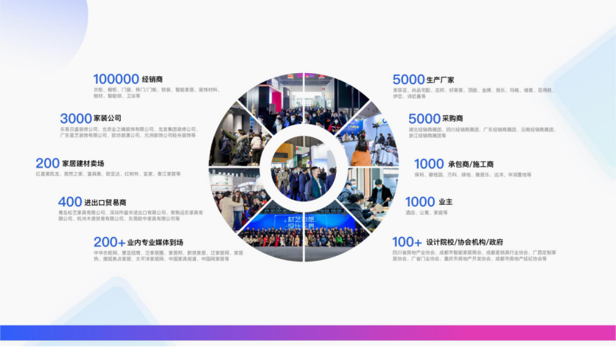 展会预计吸引10万+专业观众前来,其中包括了经销商、采购商、进出口贸易商、生产厂家、家装公司、承包商/施工商、家居建材卖场、设计院校/协会机构/政府、业主、媒体等专业观众。